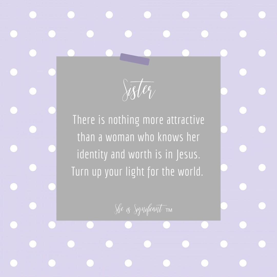 Look up those verses and speak them out loud, starting with ‘I am‘. Believe that it is His Word working effectively in you. You are accepted by God, secure in Him, and significant to His Kingdom. You are God’s greatest creation. Your identity is in Jesus Christ, not your struggle. Turn up your light!