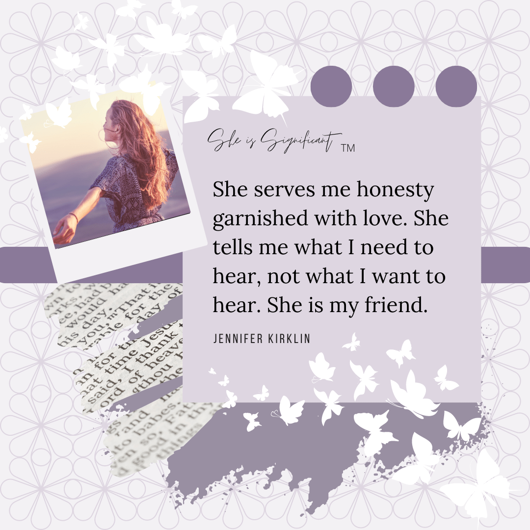 A true friend will serve you honesty garnished with love. She will tell you what you need to hear, not what you want to hear.