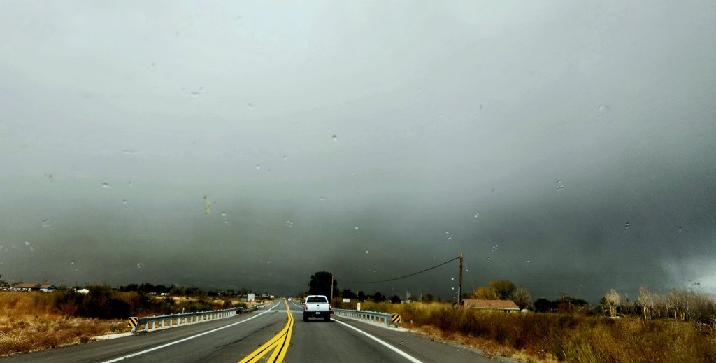 I was driving home from visiting my parents and was anticipating missing most of the storm that was rolling in over Donner Summit. Once I crossed the Summit I was grateful that I had gotten ahead of it. When my drive took me down into the Lassen Valley, taking in all the beauty that was around me in the display of brilliant Fall colors scattered over the backdrop of glistening peaks, and valleys covered in golden hues of dry grass where herds of wild horses gathered, on the road ahead was an ominous site.