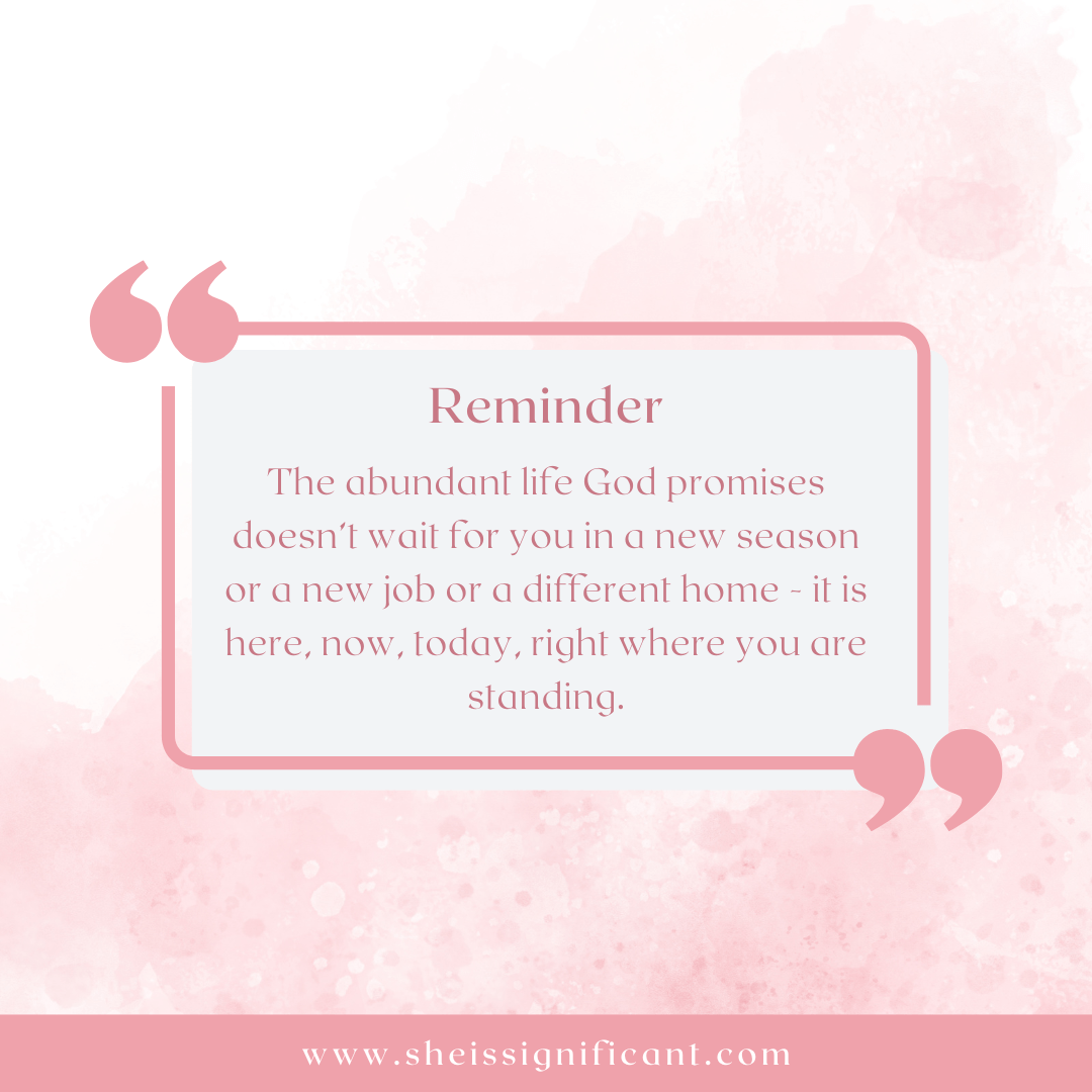 In John 10:10 we read two powerful points. The first point is that the enemy is sly, elusive, and a trickster that wants to rob us of peace, contentment, hope, and joy. The second point; the abundant life God promises doesnāt wait for me in a new season or a new job or a different home – it is here, now, today, right where I am standing.